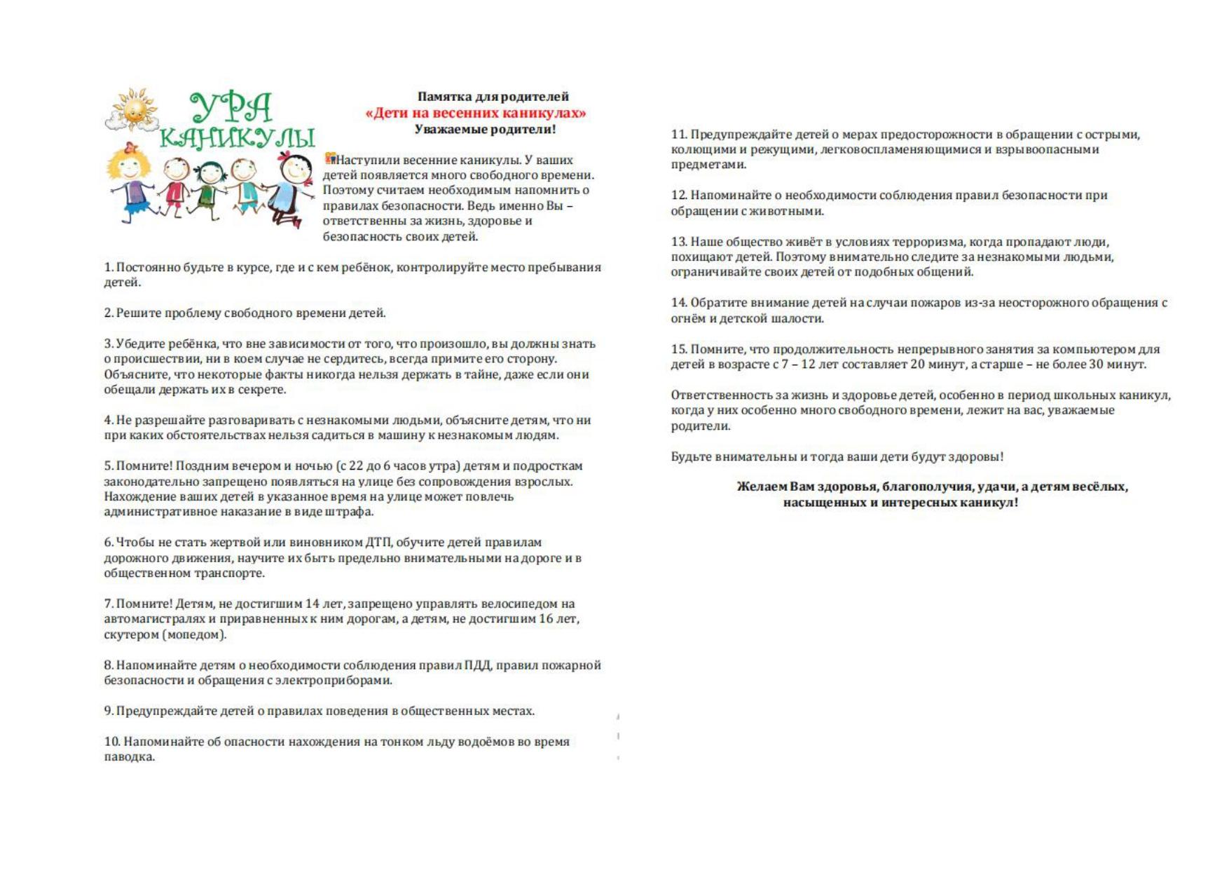 Зимние каникулы 2025-2026. Памятки по безопасностиКаникулы под знаком безопасностиПамятка для родителей «Правила безопасного поведения учащихся в период зимних каникул»Уважаемые родители!1. Формируйте у детей навыки обеспечения личной безопасности.2. Проводите с детьми беседы, объясняя важные...